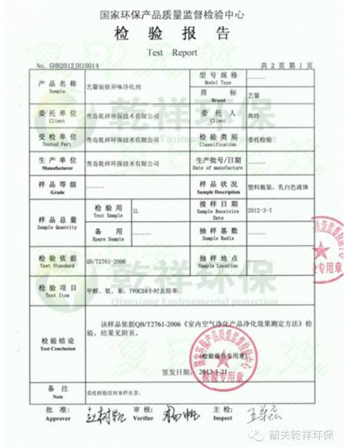 藝馨裝修異味凈化劑檢測報告